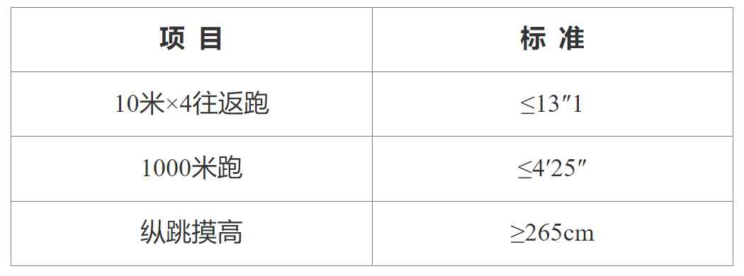 6.成绩确认:报考者先进行身高测量,再依次参加纵跳摸高、10米×4往返跑、1000米(男)/800米(女)跑,成绩现场公布。身高测量和体能测评采取单项淘汰制,全部达标为合格,进入笔试环节;身高测量或体能测评中的任何1个单项不达标,即为不合格,单项不合格的报考者立即离场,不再参加其他项目。