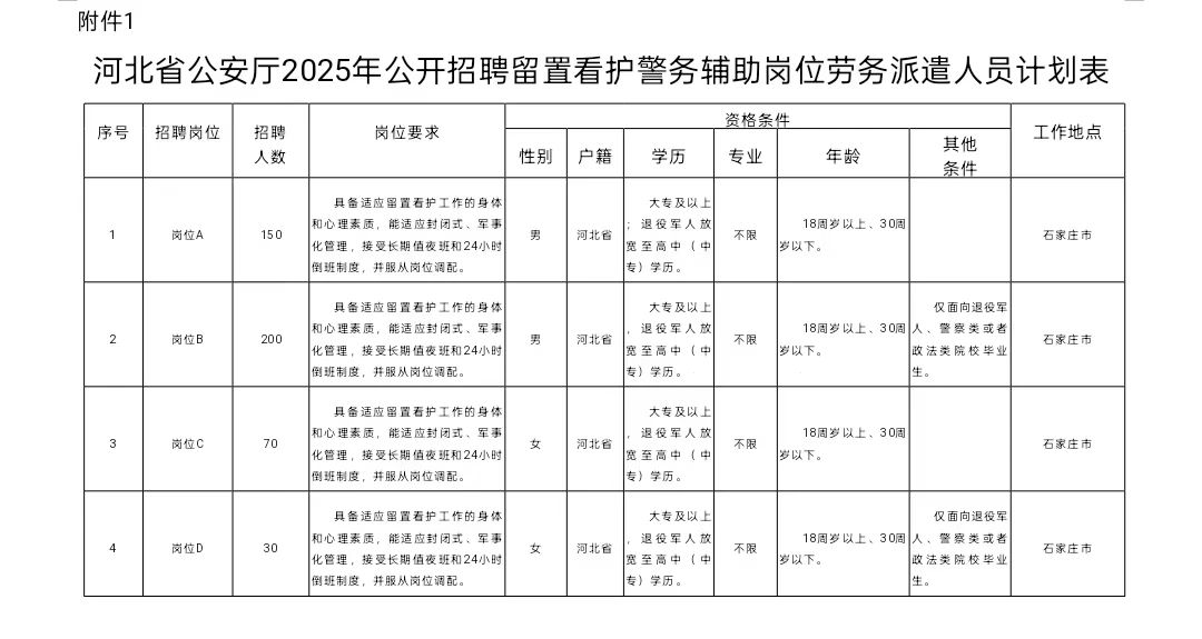 一、招聘岗位本次面向社会公开招聘留置看护警务辅助岗位劳务派遣人员450名,工作地点在石家庄市,岗位计划详见《河北省公安厅2025年公开招聘留置看护警务辅助岗位劳务派遣人员计划表》(附件1)。